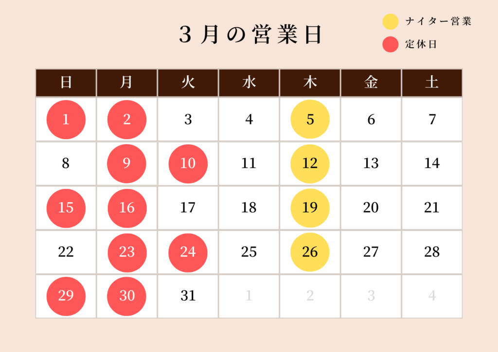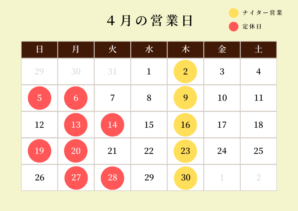 (月により、第1・第3・第5火曜がお休みになる場合があります。)